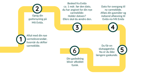 - Gasledning og måler afkobles: Din gasledning og din måler afkobler Evida rent fysisk, efter du er skiftet til en anden varmekilde. Dette har ingen betydning for, hvornår din slutopgørelse laves. Evida planlægger tidspunktet ift. andre afkoblinger i området. Evida er dog forpligtet til at komme inden for 18 måneder fra overgangsdatoen til ny varmekilde.